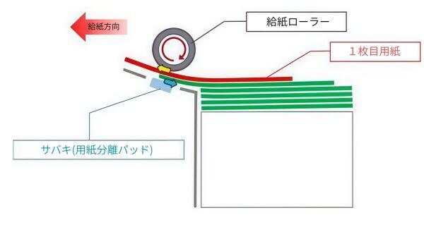その際に2枚目以降の用紙も一緒に動きだしますが、サバキの摩擦によって止められ、結果として最上部の用紙1枚だけが給紙されます。