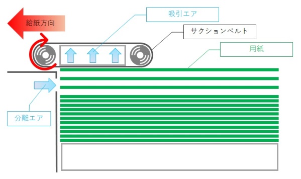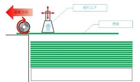 エア・サクション給紙とは、空気(エアー)と吸引(サクション)の力を組み合わせて、紙をスムーズかつ正確に送ることができる給紙方法です。